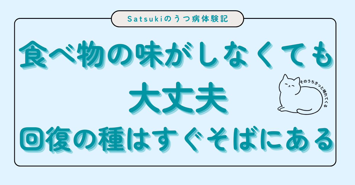 療養期間初期は、寝て起きてをするだけでも精一杯。正直、生活しているだけで奇跡的。そんな状況です。うつ病になると、正直食べ物の味がしません。私だけなのかどうかは分かりません。五感が鈍くなる感覚です。それでも徐々に味覚が落ちていたせいか、食べ物の味があまりしていないことには気づいていませんでした。